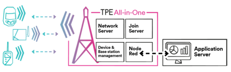 Das Produkt ThingPark Enterprise All-in-one bietet ein Einstiegsniveau, ein einzelnes Gateway und ein privates LoRaWAN®-Netzwerk. Die Funktionen des LoRaWAN® Network Server und des Join Server sind im Gateway eingebettet.