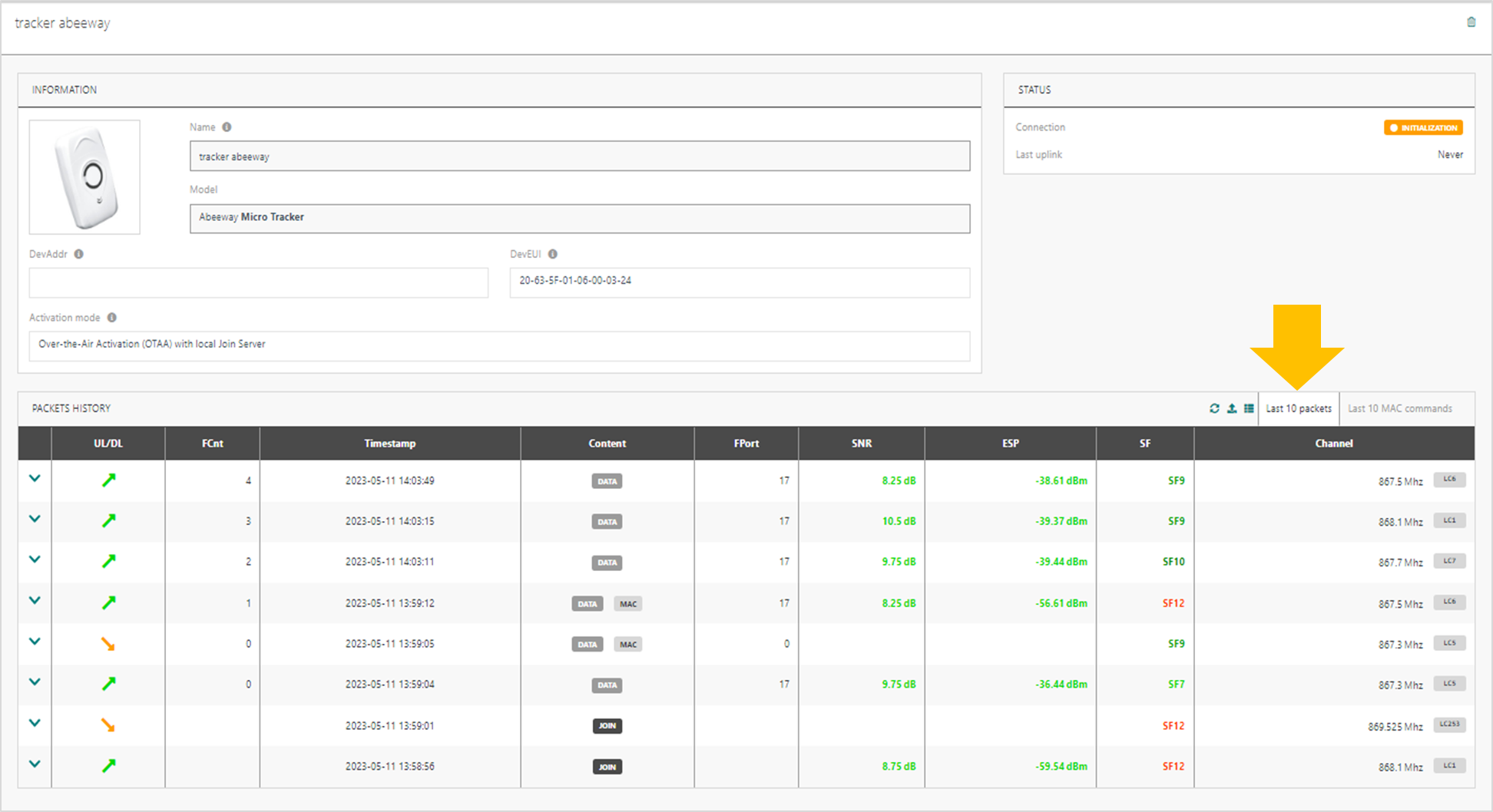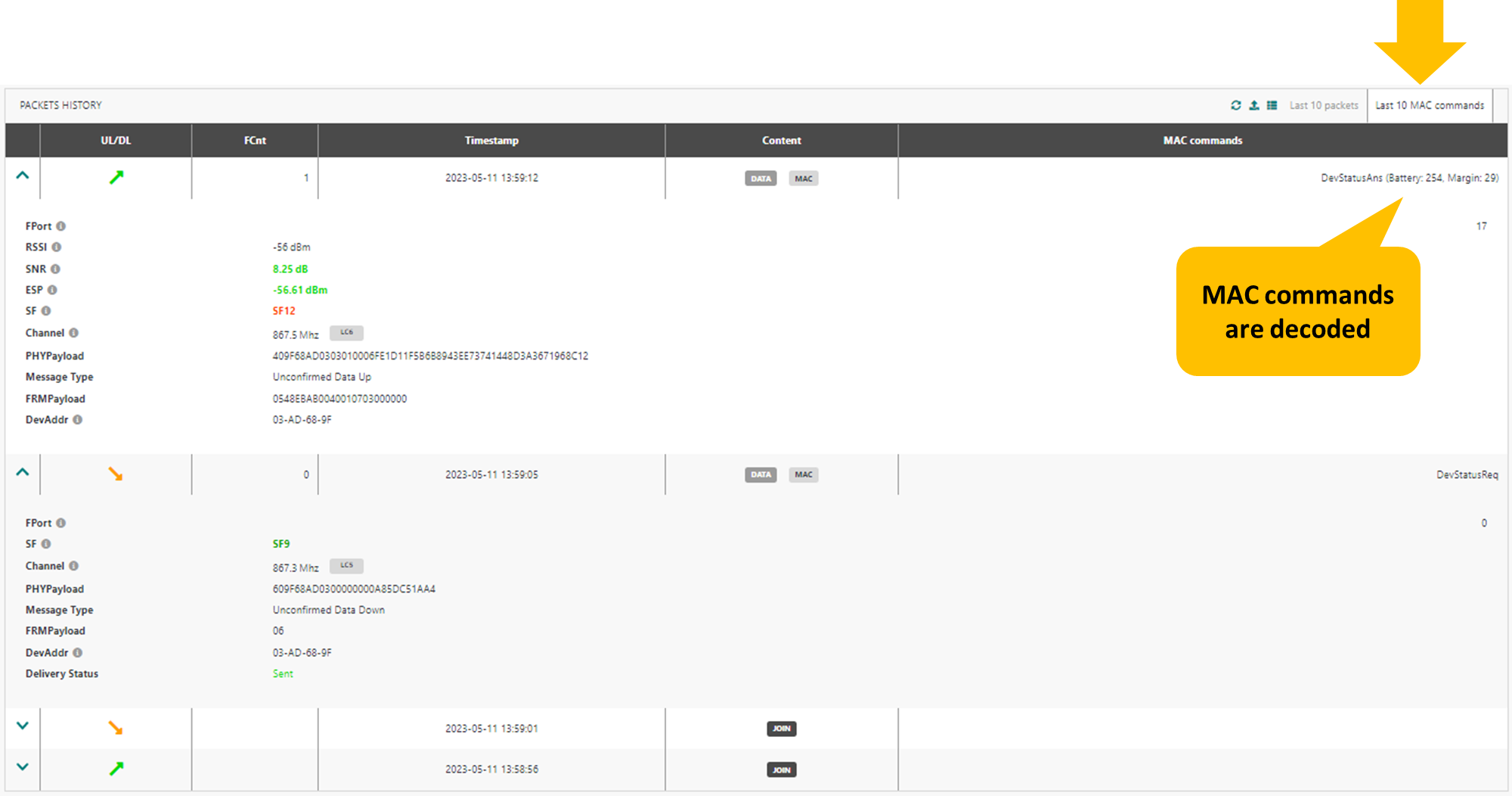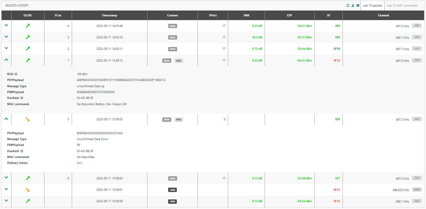 Diese Registerkarte zeigt die letzten 10 UL/DL‑MAC‑Befehle an, selbst wenn sie älter sind als die letzten 10 UL/DL‑Frames. Ziel ist es, Administratoren von ThingPark Enterprise All-in-one zu ermöglichen, auf den Verlauf der MAC‑Befehle des Geräts zuzugreifen (auch wenn danach viele UL/DL‑Pakete ausgetauscht wurden), um die Fehlerbehebung bei Funkproblemen zu vereinfachen.
