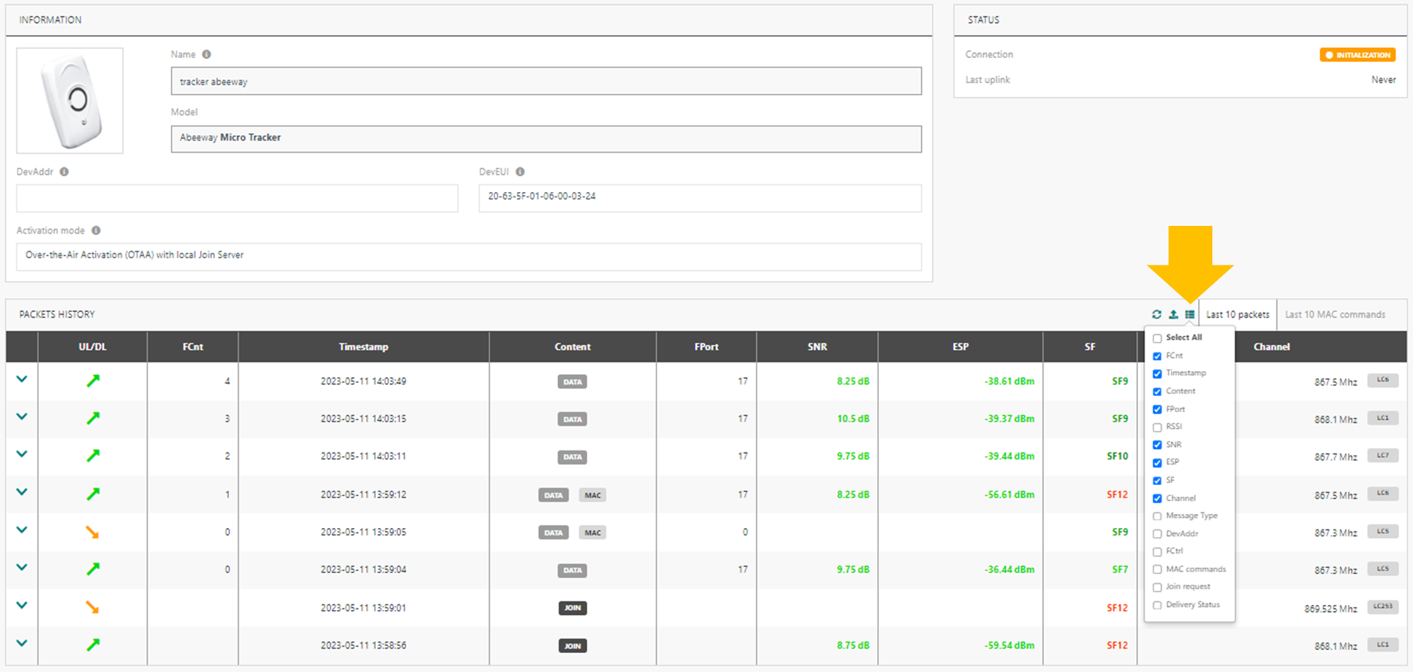 In der Geräteliste können Sie auf den Gerätenamen klicken, um auf die Geräteinformationen und das Verlaufspanel der letzten 10 Pakete zuzugreifen: