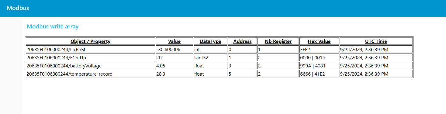 Sobald der Flow läuft, werden alle extrahierten data aus Ihren LoRaWAN-Sensoren als Modbus-Werte in den Holding-Registern bereitgestellt.
