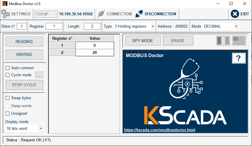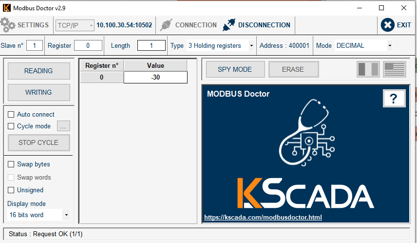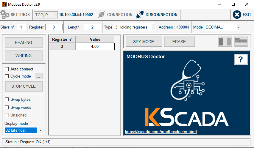 Sie können ein Tool wie Modbus Doctor verwenden, um den Inhalt zu visualisieren:
