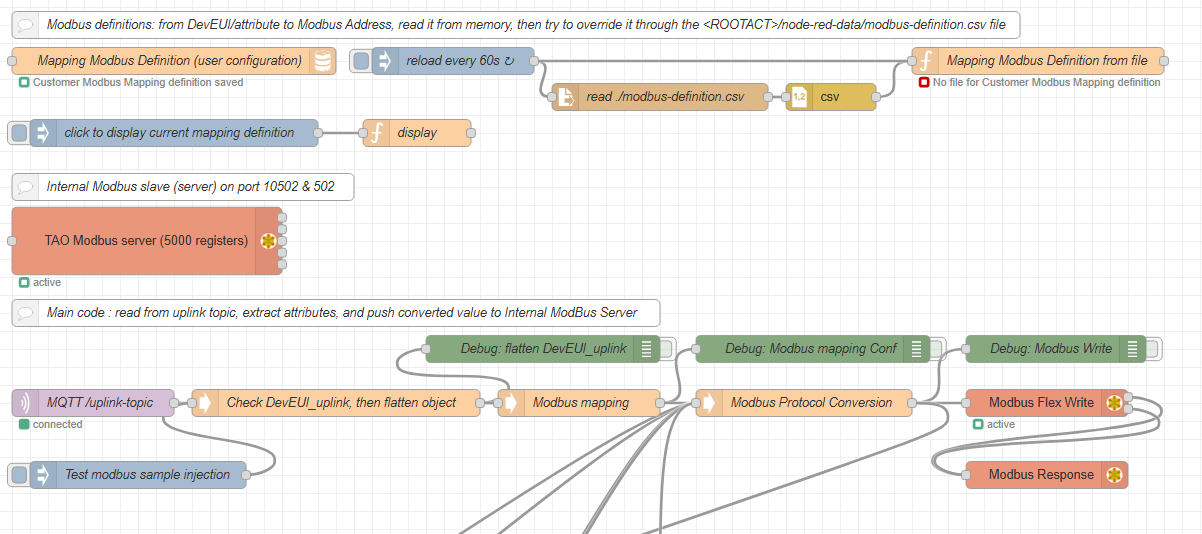 Ab TAO Version 2.1.0 wird in Node-Red ein Modbus-Flow bereitgestellt. Damit können LoRaWAN-Sensoren data in einem integrierten Modbus-Slave-Server bereitstellen. Dieser Server ist auf dem Standard-TCP-Port 10502 verfügbar.