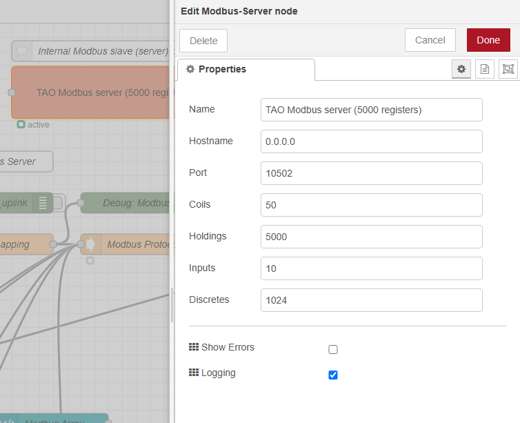 Doppelklicken Sie im ModBus-Flow auf den Knoten TAO Modbus server (5000 registers), um seine Einstellungen zu ändern: