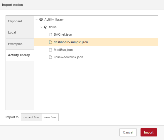 - Wählen Sie Actility library -> flows -> dashboard-sample.json.