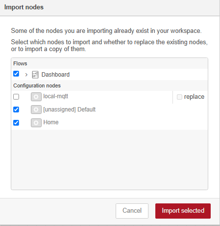 Stellen Sie im Fenster "Import nodes" sicher, dass "BACnet flow example" ausgewählt ist, und klicken Sie dann auf Import selected.