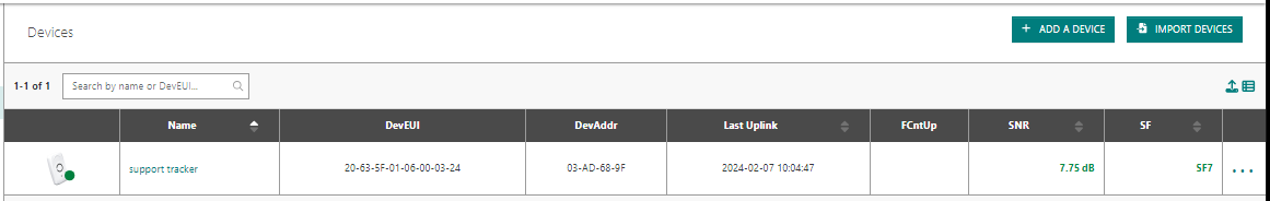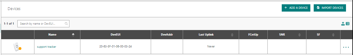 - DevEUI wird angezeigt, aber die DevAddr ist für das OTAA‑Gerät noch nicht zugewiesen. Diese DevAddr-Zuweisung erfolgt nur, wenn das Gerät seine erste Join-Request-Nachricht sendet.