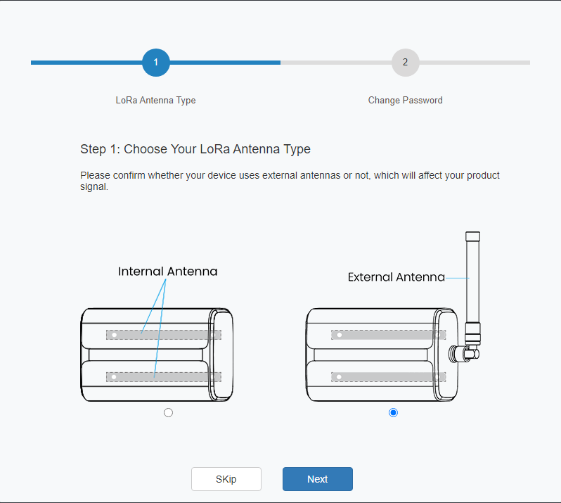 Beim ersten Verbindungsaufbau müssen Sie den Antennentyp konfigurieren und das Admin-Passwort ändern. Sie können wählen, ob Sie mit der Konfiguration fortfahren oder sie überspringen möchten.