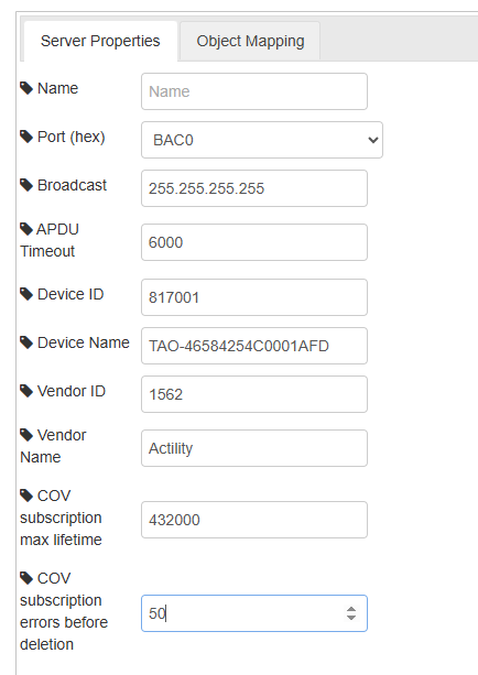 - Erreurs d'abonnement COV avant suppression : ce paramètre définit le nombre maximal d'erreurs de notification consécutives autorisées avant de supprimer automatiquement l'abonnement COV. La valeur par défaut est 50.