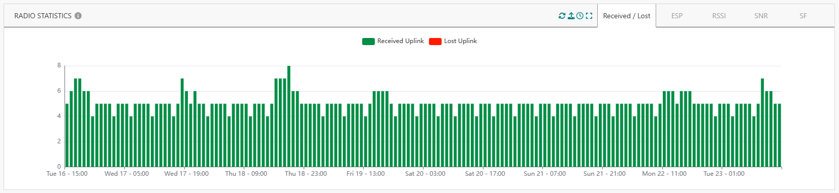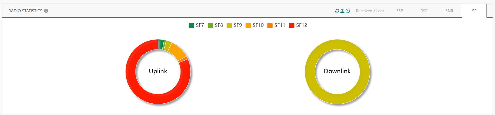 In the RADIO STATISTICS widget, check-out the time evolution of the main radio metrics associated with your device. To learn more about each radio metric, see see Dynamic device attributes.