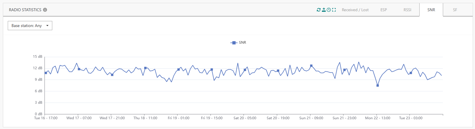 The default setting is “any” base station, which means that data represents the best gateway for each uplink, averaged over hourly or daily periods. -