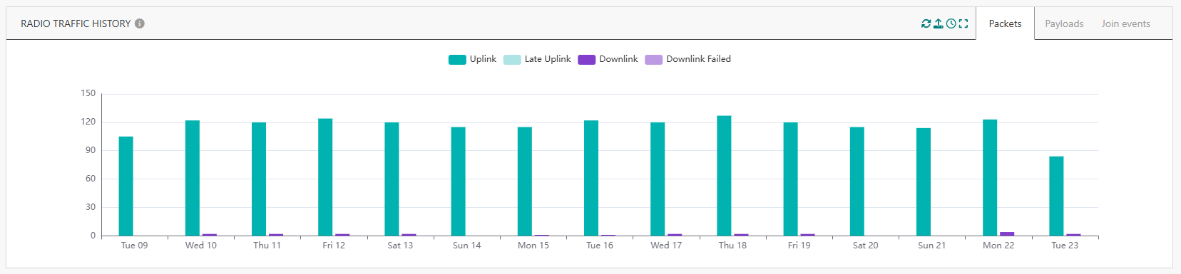 Packets show all uplink/downlink packets regardless of the message type while Join events only show Join Request/Join Accept messages. Payloads show the aggregated volume of uplink/downlink applicative data payloads in bytes.