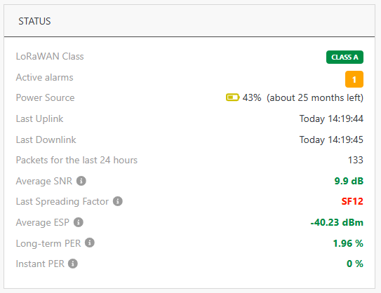 The detailed page of each device provides a rich set of metrics and radio statistics, allowing you to monitor the device performance and troubleshoot its connectivity to ThingPark.