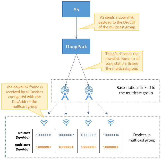 From ThingPark standpoint, the network server does not know the mapping between the "virtual" multicast device and the "real" devices associated to it. The following figure illustrates the end-to-end downlink transmission flow: