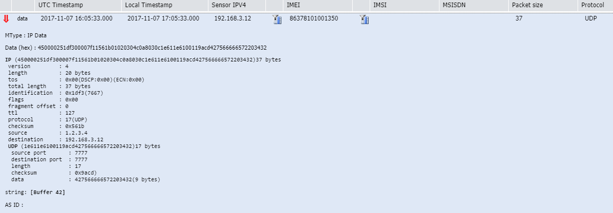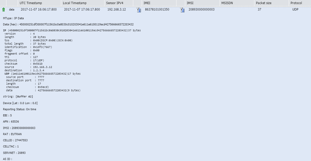 Note The UDP source port is 7777 which classifies uplink UDP packet received by the MTC-LTE-GW as a message mode packet.