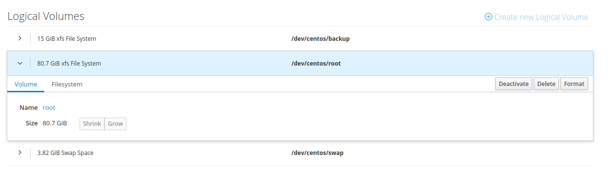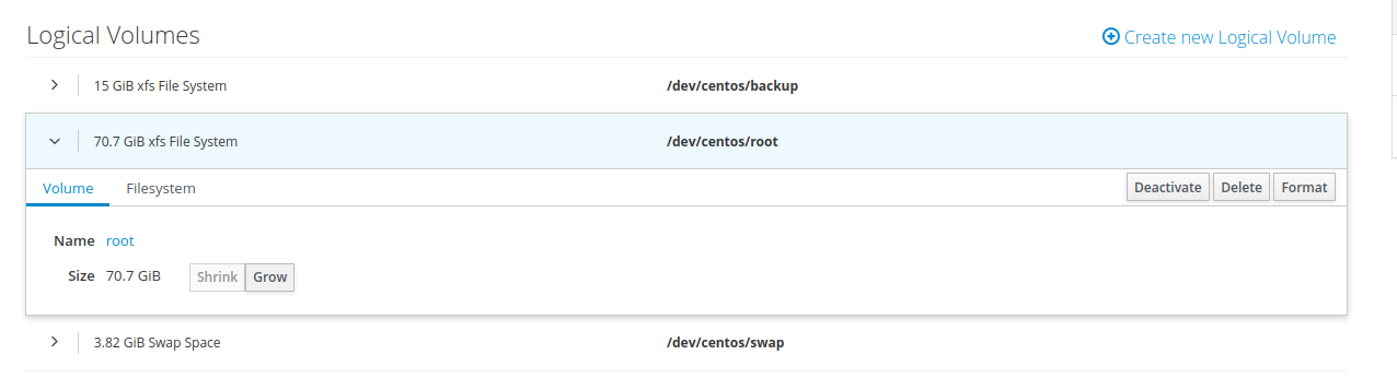 Sélectionnez le volume logique /dev/centos/root et sélectionnez "Agrandir"