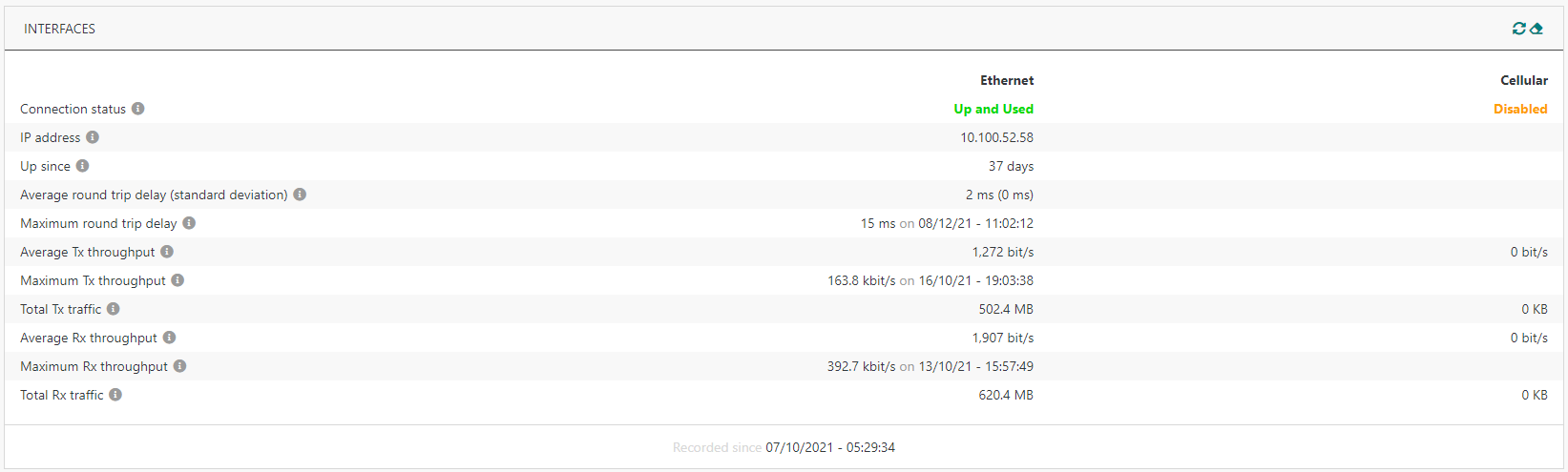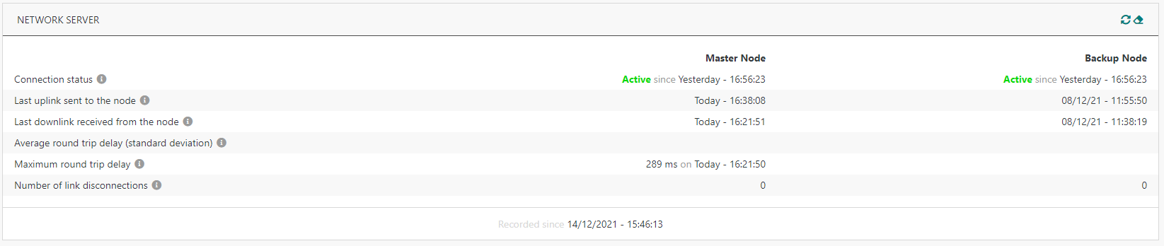De nouveaux widgets ont été ajoutés pour les indicateurs détaillés de chaque interface réseau (débit TX/RX, volume de trafic, délai aller-retour...) ainsi que les statistiques de backhaul entre la passerelle et chaque nœud du Network Server :