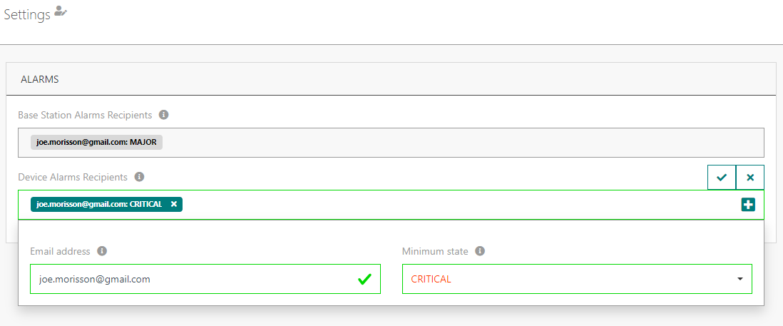 La nouvelle configuration peut être effectuée directement depuis l'interface TPE, via le panneau Settings dans le menu de gauche > widget Alarms :