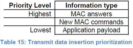 À partir de la version 7.1, et conformément à la spécification LoRaWAN® 1.0.4, la priorité est donnée aux commandes DL MAC sur le payload applicatif DL, selon l'ordre de priorité suivant extrait de la spécification LoRaWAN® 1.0.4 (tableau 15) :