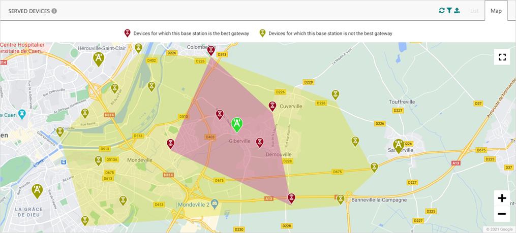 sur la carte. La couleur de l'indicateur reflète l'état de santé de la passerelle.