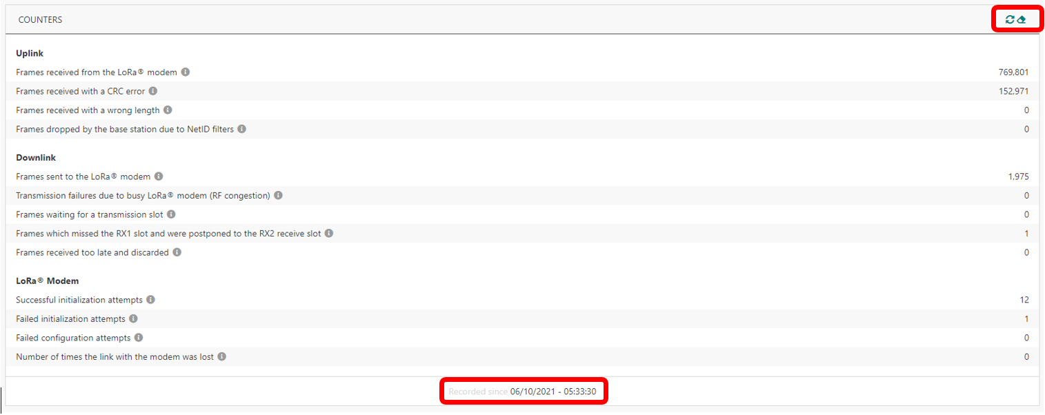 Compteurs bruts agrégeant des événements spécifiques liés à la réception uplink, à la transmission downlink ainsi qu'aux événements du modem LoRa. Ces compteurs sont agrégés sur une période de mesure contrôlée par l'utilisateur (c'est-à-dire que la période de mesure peut être réinitialisée à tout moment depuis l'interface graphique de TPE, via le bouton "Réinitialiser les indicateurs").