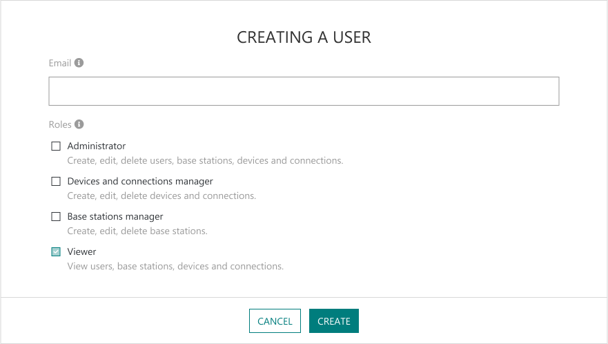 Lorsque la fédération d'authentification est activée, les utilisateurs doivent encore être créés dans l'interface utilisateur de TPE pour avoir accès aux services de TPE. Dans ce cas, le formulaire de création d'utilisateur se limite à un e-mail et des rôles.