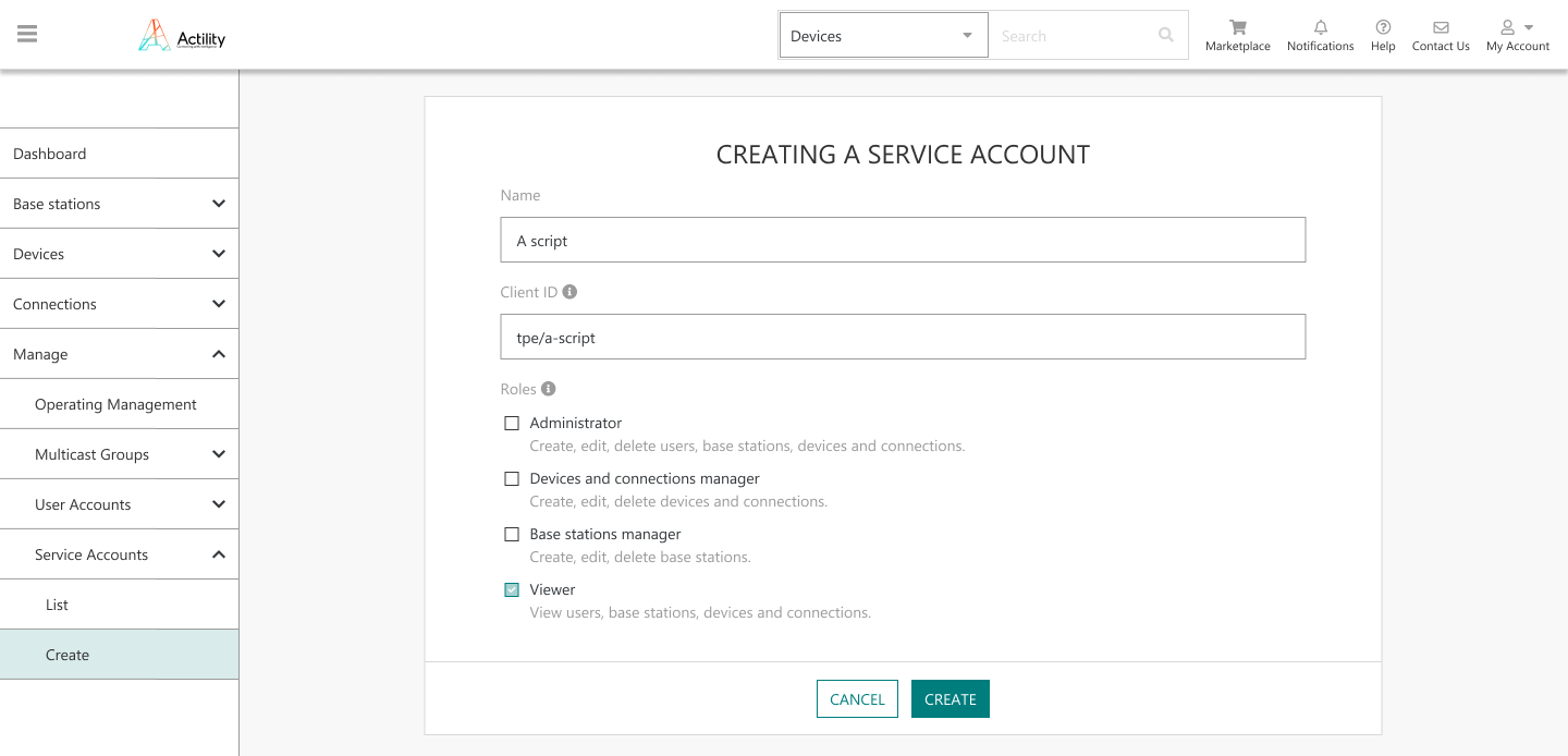 L'administrateur doit remplir le formulaire de création et définir un identifiant client et un (des) rôle(s) à chaque compte de service.