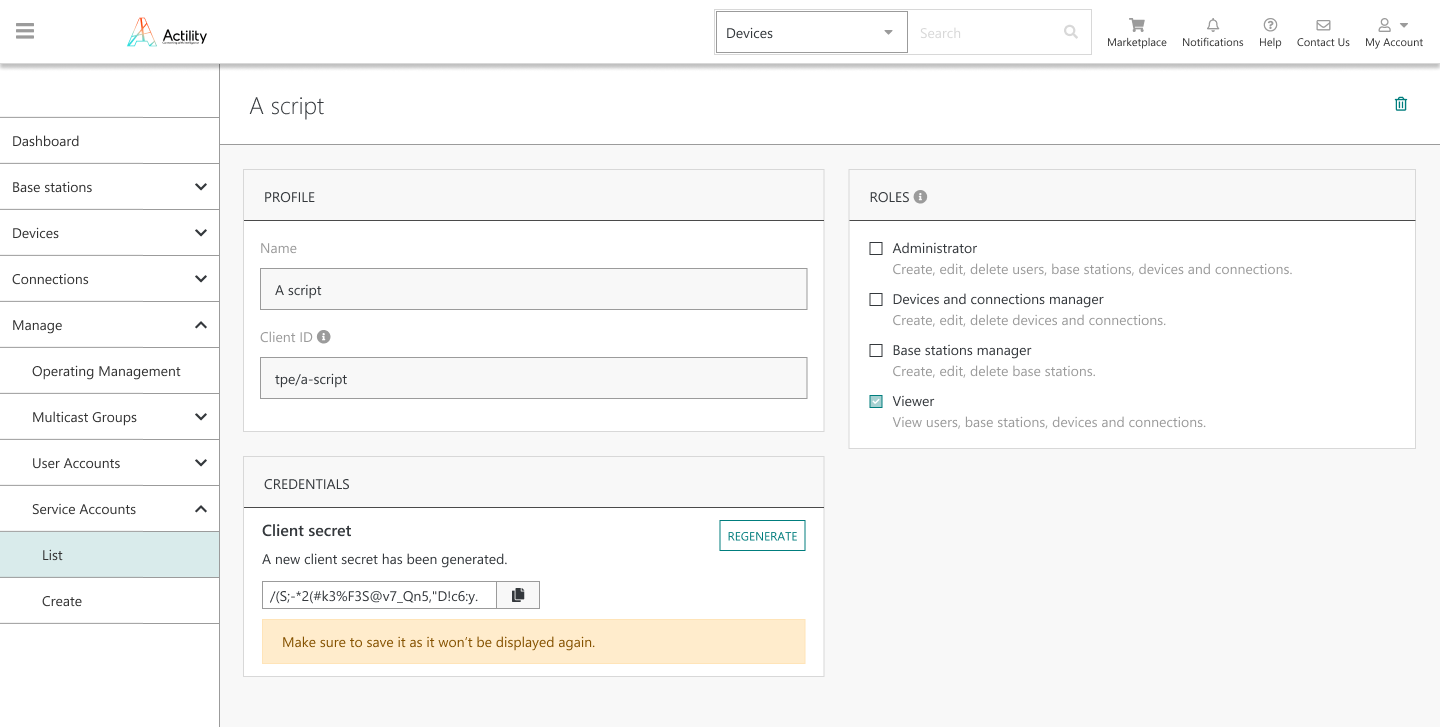Le secret client est affiché uniquement lors de la création initiale du compte de service, l'administrateur doit le copier à cette étape car il ne s'affichera plus sur l'interface graphique pour des raisons de sécurité. En cas de perte du secret client initial, l'administrateur peut régénérer un nouveau secret (également affiché une seule fois par l'interface graphique, lors de l'étape de régénération).