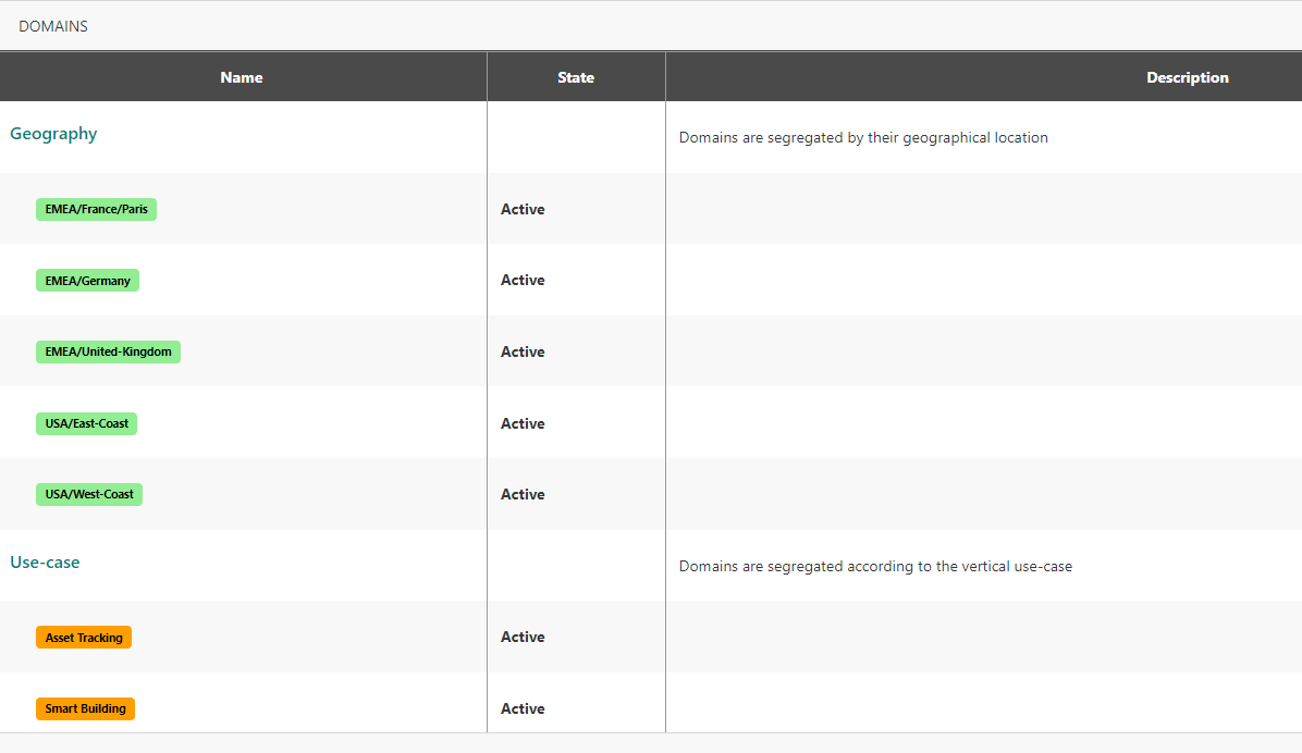 Chaque domaine appartient à un groupe de domaines. Un groupe de domaines définit un périmètre de ségrégation. Tous les domaines regroupés sous le même cadre sont mutuellement exclusifs pour éviter les conflits de ségrégation, c'est-à-dire qu'une ressource donnée (capteur, passerelle ou groupe multicast) ne peut être associée à plus d'un domaine du même groupe. Par exemple, un capteur ne peut pas être associé à la fois aux domaines "France" et "Allemagne" qui sont regroupés sous le même groupe de domaines "Géographie".