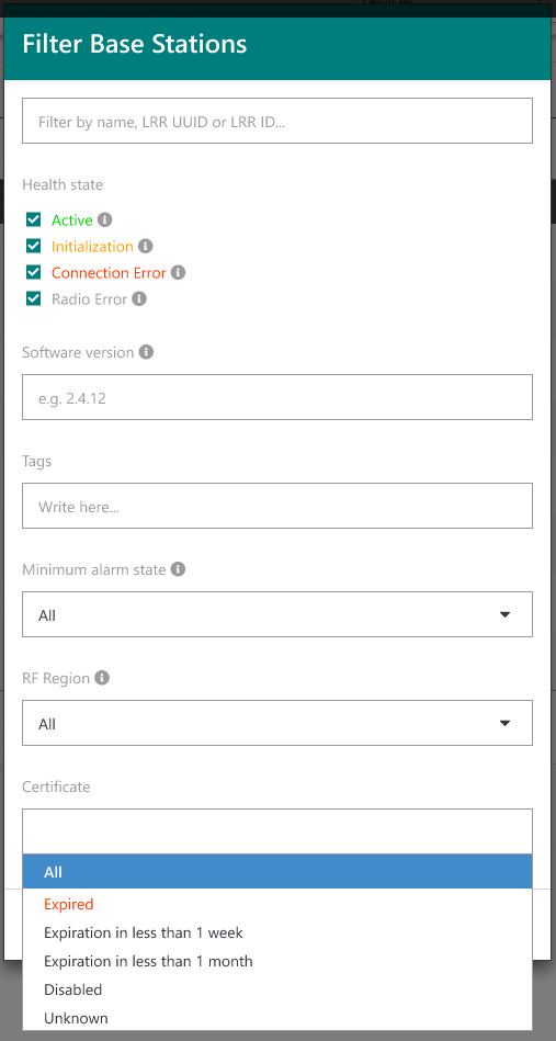 "Expiré" : La génération du certificat de la passerelle est activée, et le certificat a expiré. La date d'expiration s'affiche au survol de la souris et est ajoutée entre parenthèses dans le fichier d'export CSV.