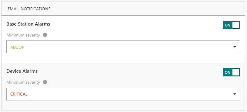 Un administrateur de l'abonnement TPE peut activer/désactiver les notifications par email pour les alarmes de périphérique et/ou de passerelle (avec une gravité minimale donnée) pour tout compte utilisateur.