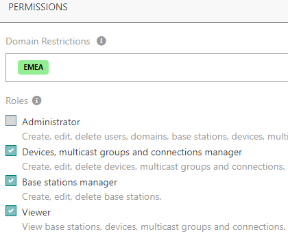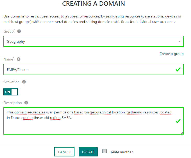 Il n'est actuellement pas possible de définir 2 Domaines du même Groupe de Domaines dans les restrictions de Domaine de l'utilisateur. Cette limitation sera levée dans une future version de ThingPark.