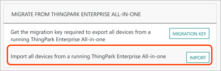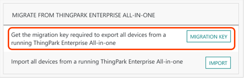Générer une "Clé de migration" à partir de l'interface graphique de l'abonnement TPE cible, sous Gestion opérationnelle > "Migrer depuis ThingPark Enterprise All-in-One" widget. Enregistrez cette clé pour la télécharger sur votre interface graphique TPE-All-in-One à l'étape #2.