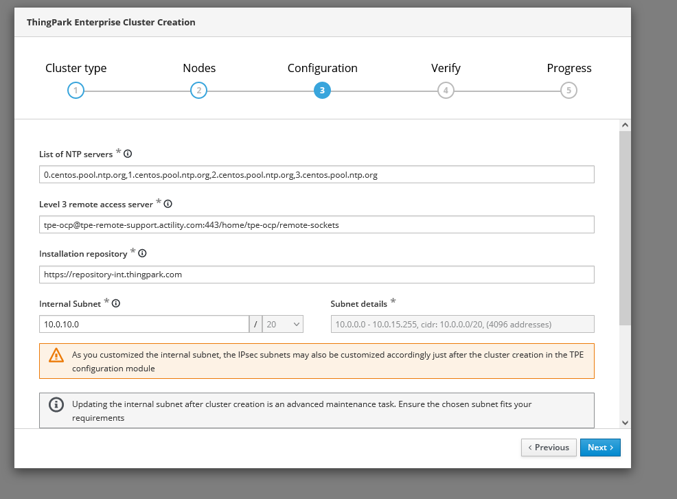 Pour une nouvelle installation TPE, l’administrateur du système TPE peut choisir le bloc IPV4 /20 que la plateforme TPE utilisera en interne. Le sous-réseau 192.168.0.0/20 est utilisé par défaut, mais l'administrateur peut changer ce sous-réseau interne dans le module « Services TPE » lors de l'étape de création du cluster.