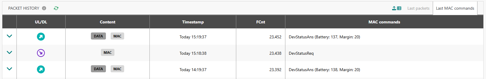L'en-tête MAC de chaque paquet est affiché au format décodé, permettant de vérifier facilement les indicateurs Acquittement (ACK) et ADR (entre autres). Des détails supplémentaires sur chaque paquet sont également disponibles, tels que le canal logique, la fréquence RF et le statut de livraison Downlink.