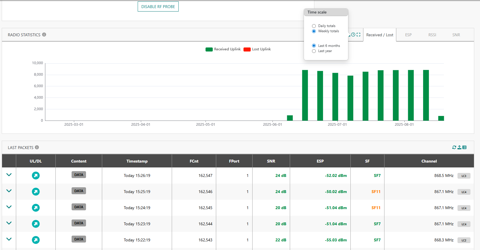 Le but de ces trames uplink est de tester la qualité RF du réseau LoRaWAN et de détecter tout dysfonctionnement RF éventuel sur la passerelle émettrice ou réceptrice. La nature déterministe du trafic des sondes RF facilite l'identification des problèmes radio sans être affecté par l'aléa du trafic LoRaWAN généré par de vrais capteurs.