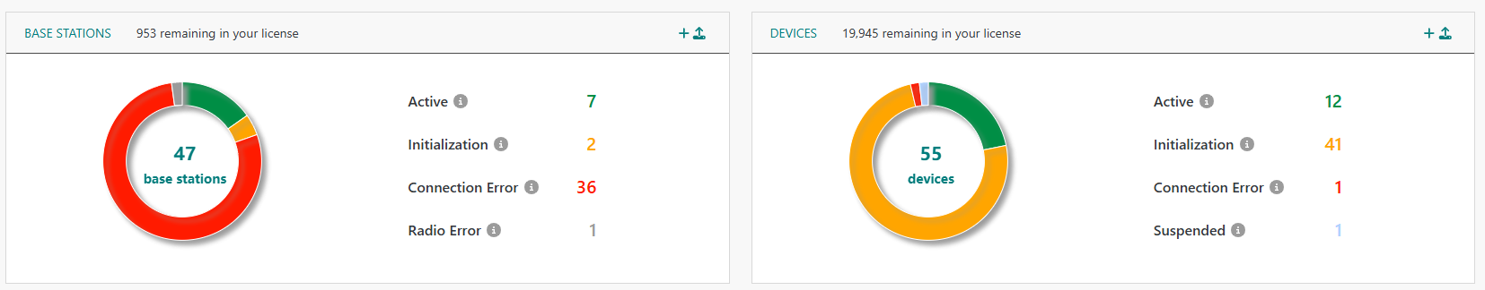 Pour permettre aux non-administrateurs de savoir combien de crédits device et/ou passerelle restent dans la licence en cours, le décompte des Capteurs et passerelles restants est désormais affiché dans le Dashboard principal, comme illustré dans l'exemple suivant :