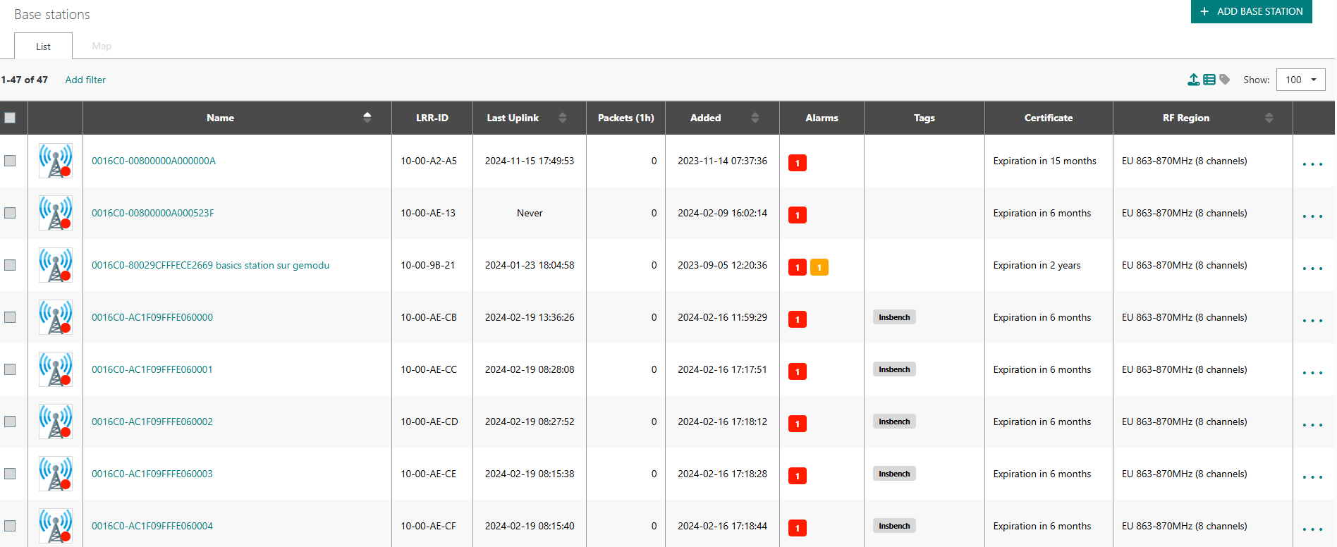 À partir de la version 8.1, la RF Region de chaque passerelle est disponible en tant que nouvelle colonne de la vue liste et est également présente dans le fichier csv exportable.