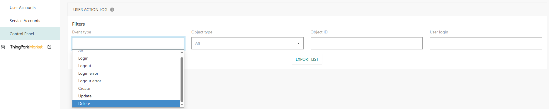 Les journaux d'actions utilisateur (également appelés audit trail) sont générés pour toutes les opérations d'écriture et les opérations de connexion/déconnexion effectuées par les comptes utilisateur et les comptes de service associés à l'abonnement. Ils permettent de suivre les actions suivantes sur l'ensemble des ressources ThingPark concernées :