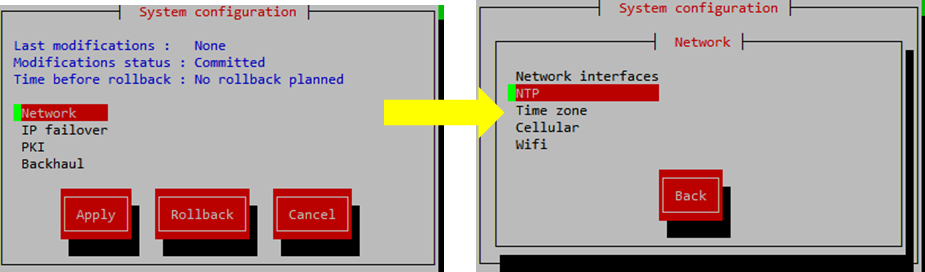 - Depuis le menu racine de SUPLOG, choisissez Configuration système, puis Réseau puis Fuseau horaire.