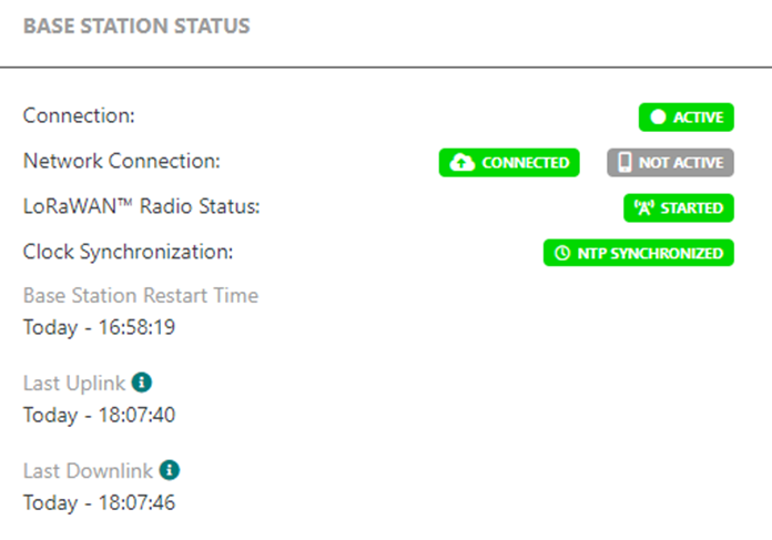 À tout moment, si votre passerelle se déconnecte (par exemple, elle est éteinte), son statut affichera "Erreur de Connexion", avec un point rouge. Un point gris signifie "Erreur Radio", ce qui met généralement en évidence une erreur interne RF (la radio peut être éteinte) tandis que la passerelle est toujours connectée au réseau de base de ThingPark. Pour en savoir plus sur les différents états des passerelles, consultez Les états de santé des passerelles.