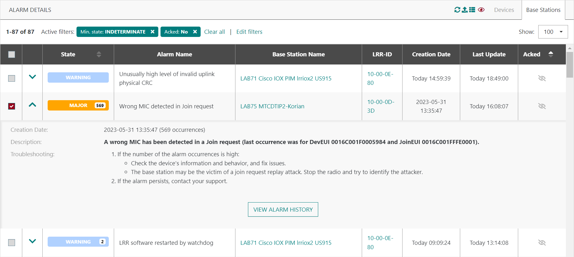 Par défaut, les alarmes qui sont soit effacées, soit reconnues sont masquées car elles ne nécessitent pas d'action corrective, et les dernières alarmes mises à jour sont affichées en premier. Les options par défaut de filtrage et de tri peuvent être personnalisées, consultez Filtrage des alarmes de passerelle pour plus de détails.