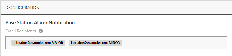 -> Dans Notification d'alarme de passerelle > Destinataires de l'e-mail, chaque destinataire d'e-mail est affiché comme un badge contenant l'adresse e-mail et la gravité minimale :