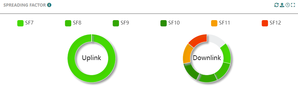Vous ne devriez avoir qu'une petite fraction d'images utilisant les débits de données les plus bas (SF11 et SF12). Puisque ces faibles débits de données consomment plus de temps d'antenne, les réseaux LoRaWAN® ont une capacité inférieure à ces débits. Les capteurs consomment plus d'énergie lorsqu'ils fonctionnent à des débits de données plus faibles.