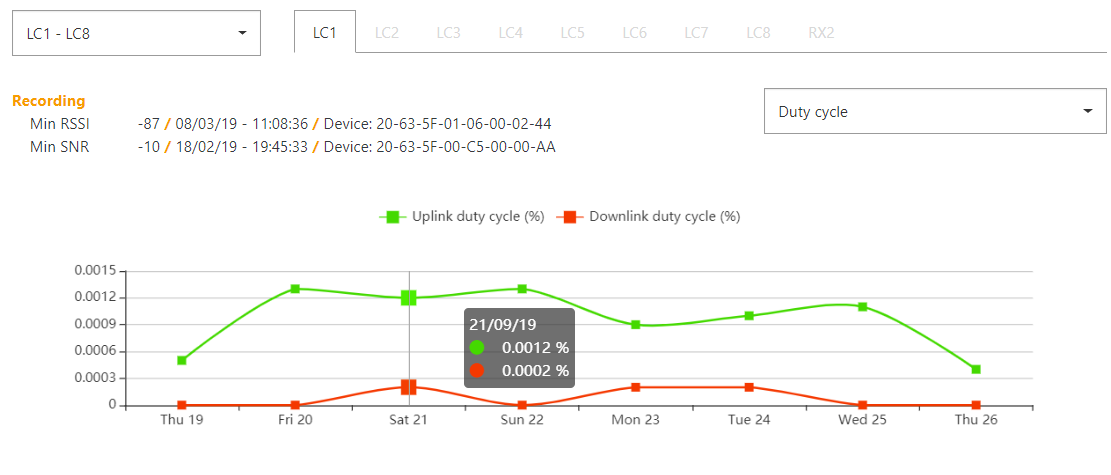 Selon le matériel de la passerelle et les paramètres de la RF region, vous pouvez avoir 8 ou 16 canaux logiques uplink et plusieurs canaux logiques downlink. Sélectionnez les plages de canaux logiques dans le menu déroulant en haut à gauche du graphique pour afficher une nouvelle page de canaux logiques.
