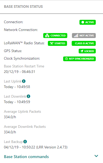 - Le statut de la radio LoRaWAN® est activé et indique que la passerelle supporte les capteurs de classe B.