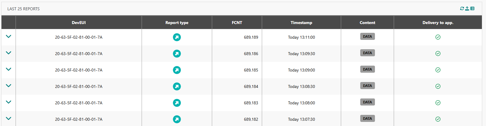 Si un rapport uplink/downlink contient une payload applicative, vous pouvez la visualiser en dépliant la ligne via l'icône