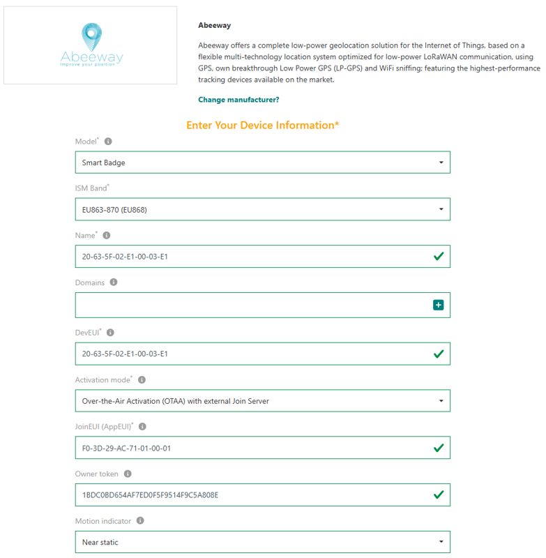 L'étiquette peut également inclure le Owner token en tant qu'élément optionnel. Cet élément est fourni lorsque les capteurs sont pré-commissionnés sur un Join Server externe par le fabricant du capteur. Il est alors utilisé par le propriétaire du capteur comme preuve de propriété physique lors de l'étape de commissionnement dans ThingPark.