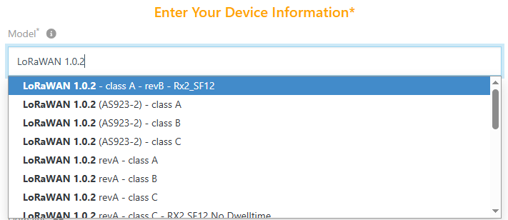 3. Sélectionnez le Modèle de votre capteur. Si le même modèle est disponible dans plusieurs bandes ISM (également appelées profils régionaux), vous devez sélectionner la bande ISM appropriée pour votre déploiement.