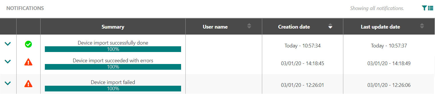 -> Une fois l'importation massive terminée, une notification s'affiche dans la barre supérieure indiquant les résultats de l'importation. Elle peut être l'une des suivantes :