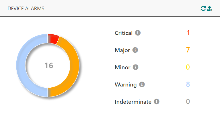 La répartition des alarmes des capteurs par sévérité fournit un aperçu des dysfonctionnements actuellement détectés sur votre parc de capteurs. Les alarmes reconnues par les administrateurs ne sont pas prises en compte dans cette répartition. Voir Affichage de la liste des alarmes des capteurs pour plus d'informations sur l'accusé de réception des alarmes.